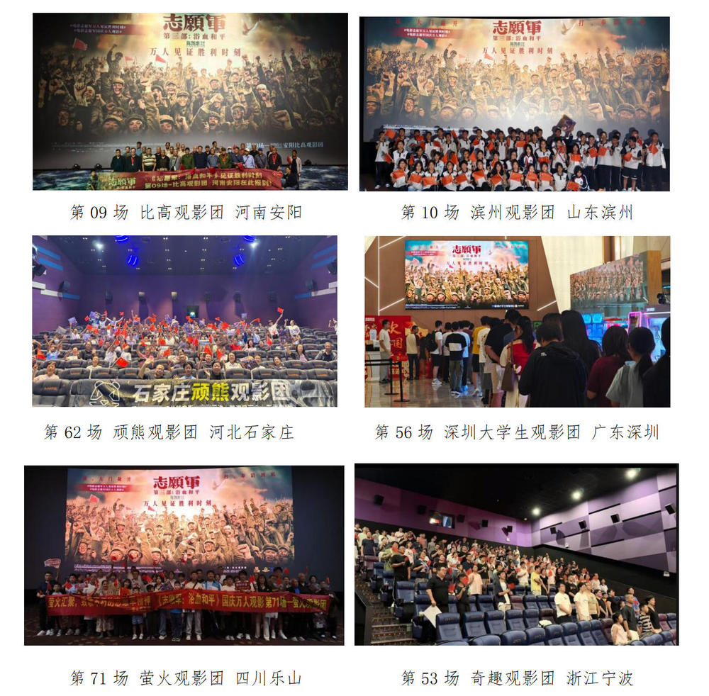 共赴英雄征程,礼赞和平胜利!10月1日新中国成立76周年之际,电影《志愿军:浴血和平》“万人见证胜利时刻”主题观影活动顺利落下帷幕。此次活动由电影《志愿军:浴血和平》携手全国76家观影团共同打造。全国多地的近万名观众在这个特殊日子里,以一场跨越山河的大银幕同频观影,共同回望了抗美援朝战场的胜利时刻,并在映后组织不同形式的活动,向用生命捍卫和平的志愿军将士致敬,共贺新中国成立76周年华诞。