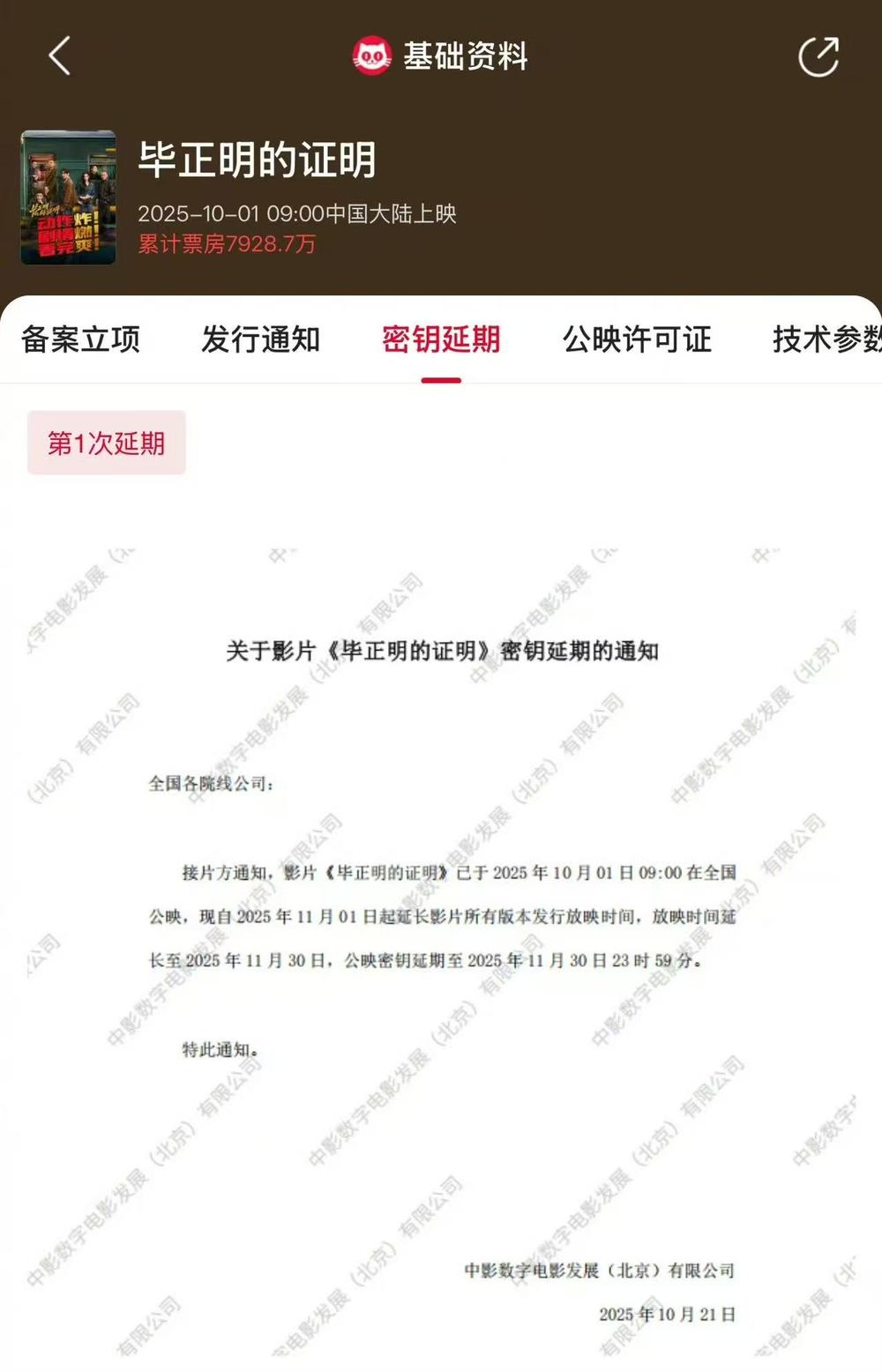 电影《毕正明的证明》官宣密钥延期,延长上映至11月30日,据猫眼专业版数据,截至当前累计票房已达7928.7万元。