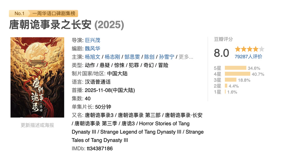 正在热播的《唐朝诡事录3》,作为系列IP的第三部千呼万唤始出来。导演郭靖宇手握多部口碑长剧,新作依旧保持“经费全花在刀刃上”的创作态度,场景搭建、服化道与剧本雕琢都下足了功夫。剧情不追求快节奏反转,而是以抽丝剥茧的推理和中式悬疑氛围,延续了古早探案剧的精髓。