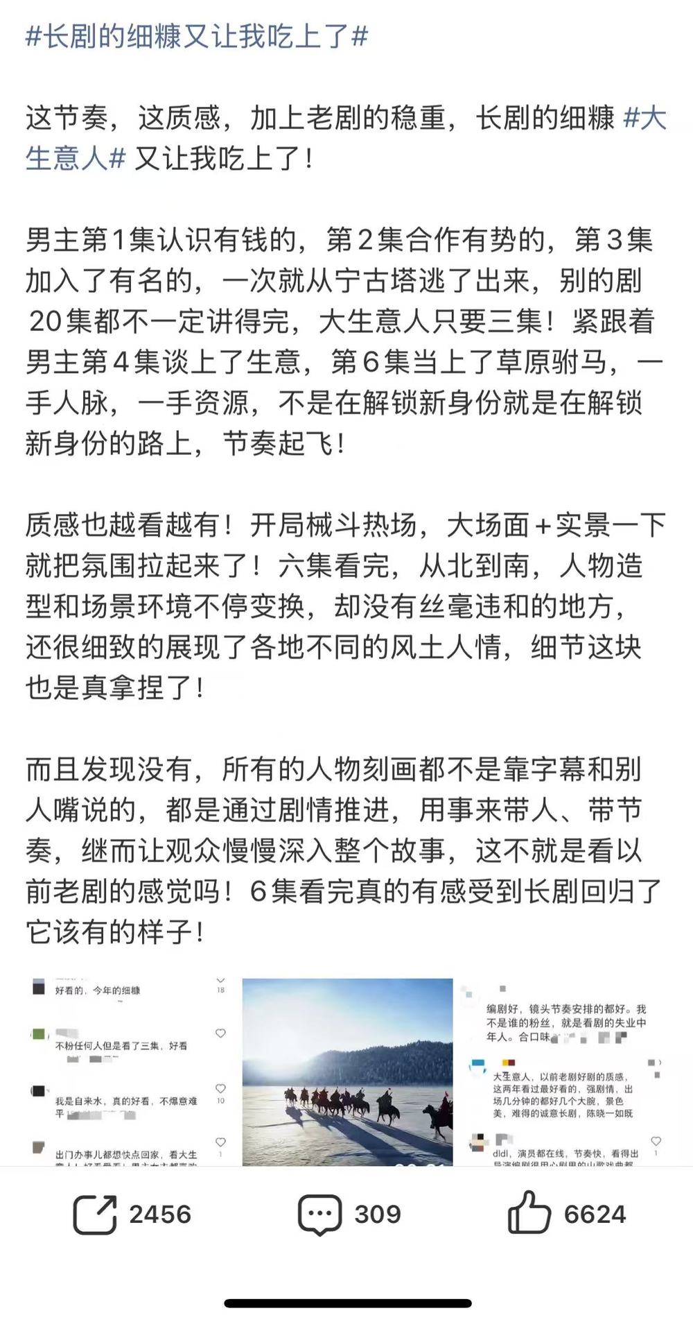 “大生意人是来报答观众的吧!这‘古早剧’的质感看得我心情舒畅。”《大生意人》首播当晚,#内娱久违的古早剧质感回来了#话题迅速发酵,网友的留言道出了大家的心声。