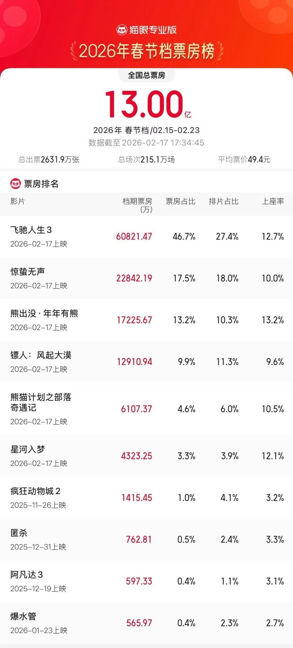 据猫眼专业版数据,2026年春节档档期总票房(含预售)破13亿,《飞驰人生3》《惊蛰无声》《熊出没·年年有熊》分列前三位。