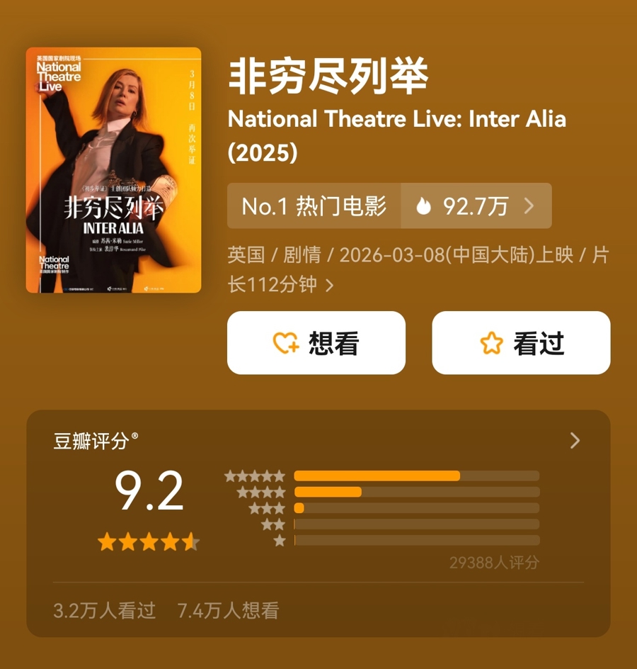 舞台纪录电影《初步举证》成为去年小众黑马,有其“精神续作”之称的《非穷尽列举》却没能点燃今年的“三八档”。电影《初步举证》已于3月8日正式上映,该片与《初步举证》一样来自NT LIVE(National Theatre Live)英国国家剧院现场,由裴淳华主演,豆瓣评分9.3。不过,截至3月9日影片票房470万元,AI预测总票房795万元,与票房3538.4万元的《初步举证》有很大差距。