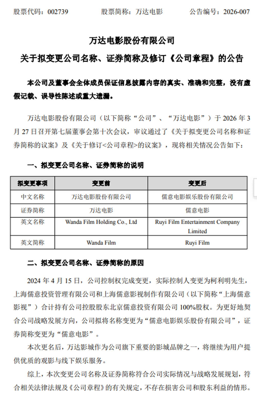 公告透露,更名是为了更好地契合公司战略转型方向,万达影城作为儒意电影旗下重要的影城品牌之一,将继续为用户提供优质的观影与线下娱乐服务。