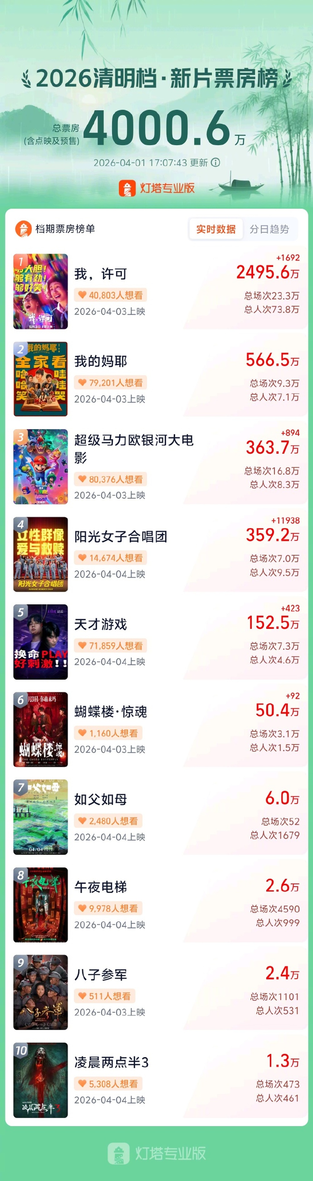据灯塔专业版,截至4月1日17时07分,2026年清明档新片点映及预售总票房突破4000万,影片《我,许可》《我的妈耶》《阳光女子合唱团》《超级马力欧银河大电影》《天才游戏》暂列前五。