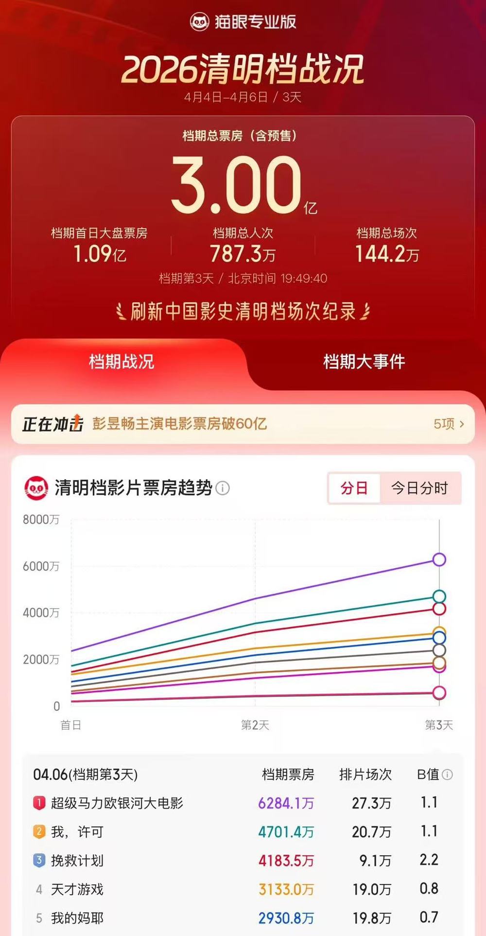 清明假期落下帷幕,据猫眼专业版数据,2026年清明档电影票房突破3亿元,进入影史同档期前十,同时,今年清明档总场次超142万,刷新中国影史清明档总场次纪录。今年清明档上映的新片以中小体量为主,缺乏大体量的商业大片,市场格局脱离“二八定律”,回归“多强并立”,多部优秀影片口碑、票房双丰收,并有望凭口碑在假期后跑出长尾效应。
