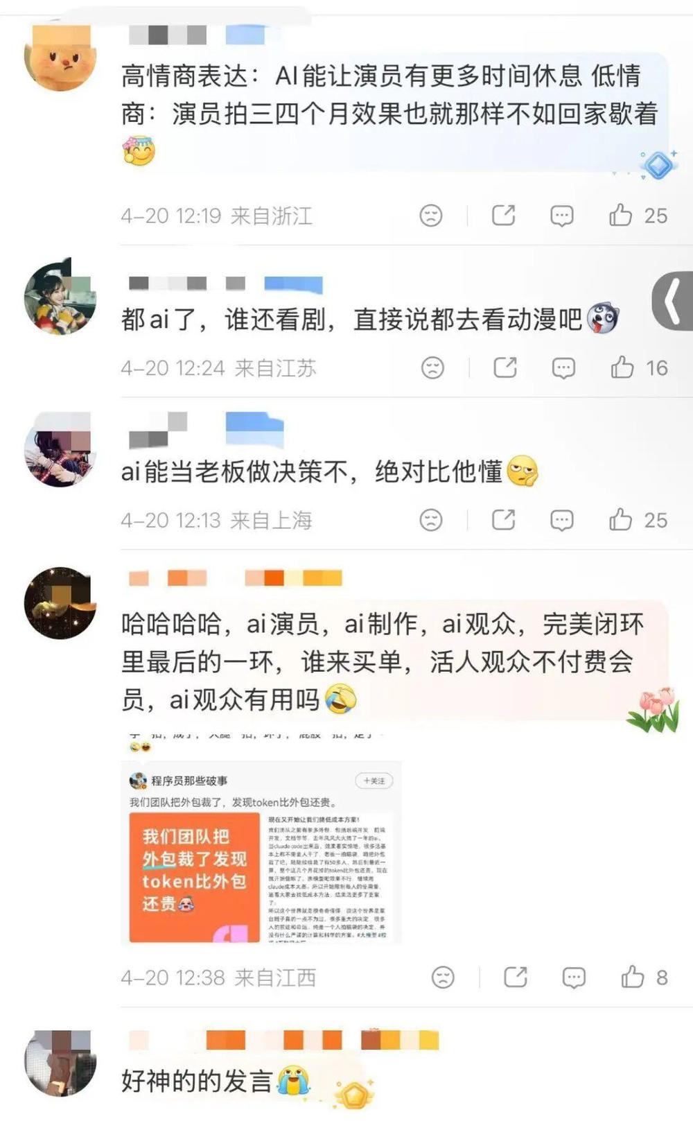 刚刚,“爱奇艺疯了”词条也登上热搜,词条下方正是网络舆论对大力推行AI艺人机制的不解,有网友提到,如果演员都AI化了,那平台干脆把观众也AI得了。