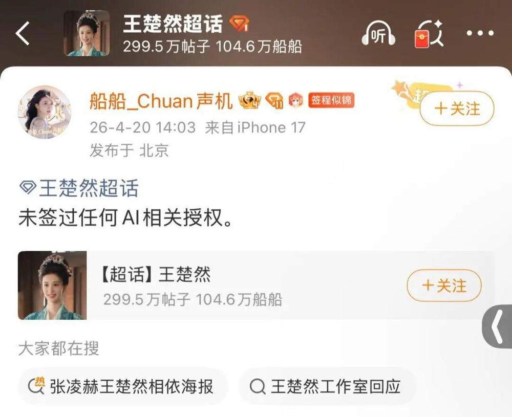 4月20日14:03.隶属于王楚然官方后援会的账号“船船_Chuan声机”在王楚然超话发布信息:“未签过任何AI相关授权。”