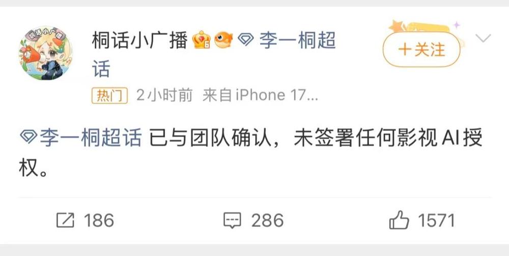 4月20日14:07.账号“桐话小广播”发文称与团队确认,未签署任何影视AI授权。