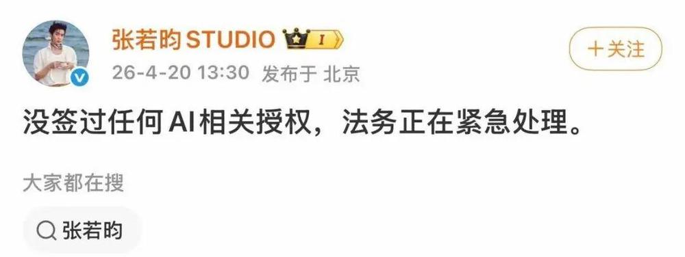 4月20日13:30.张若昀工作室紧急发布声明,表示没签过任何AI相关授权,“法务正在紧急处理。”