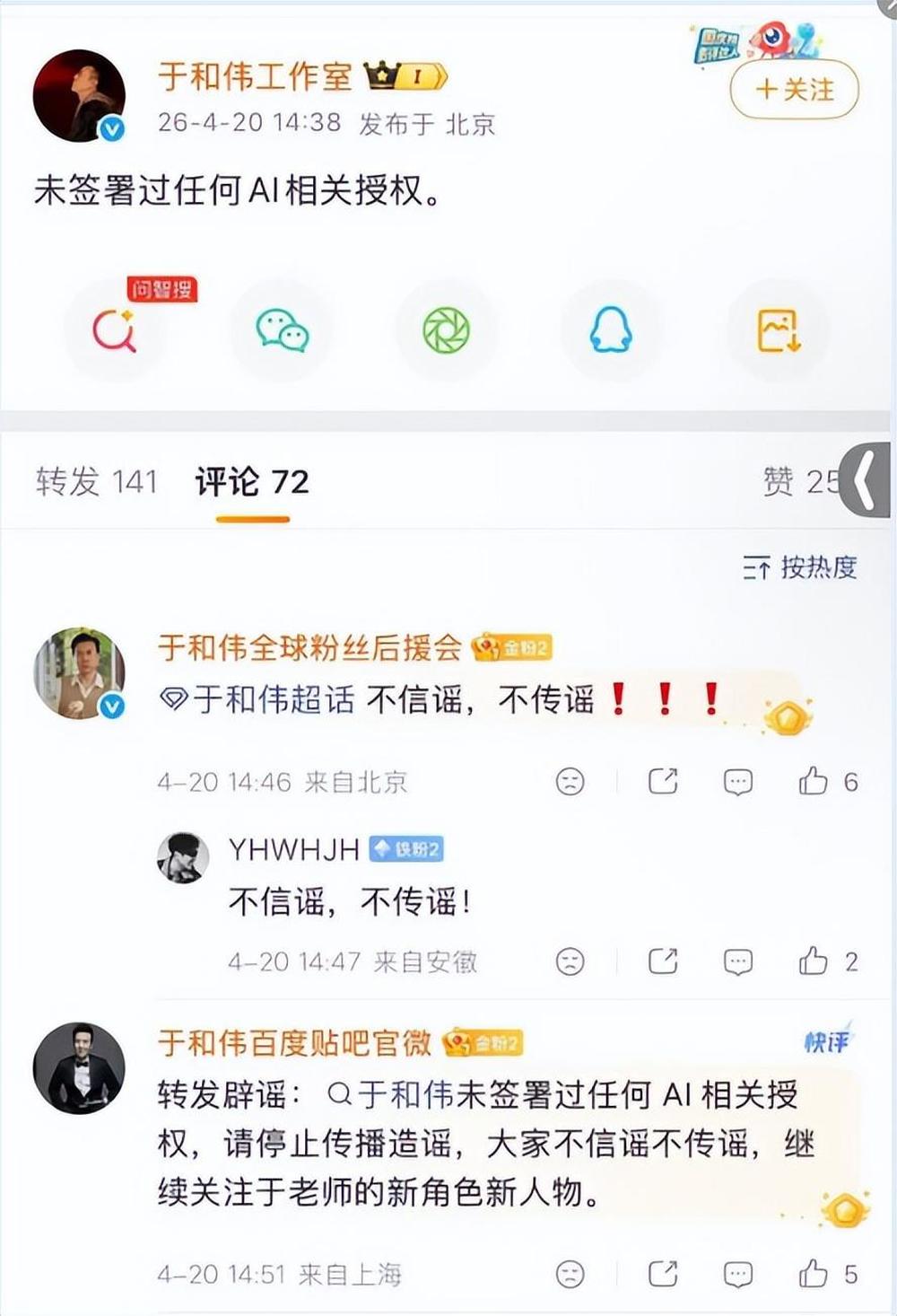 4月20日14:38.于和伟工作室发布简短声明:“未签署过任何AI相关授权。”