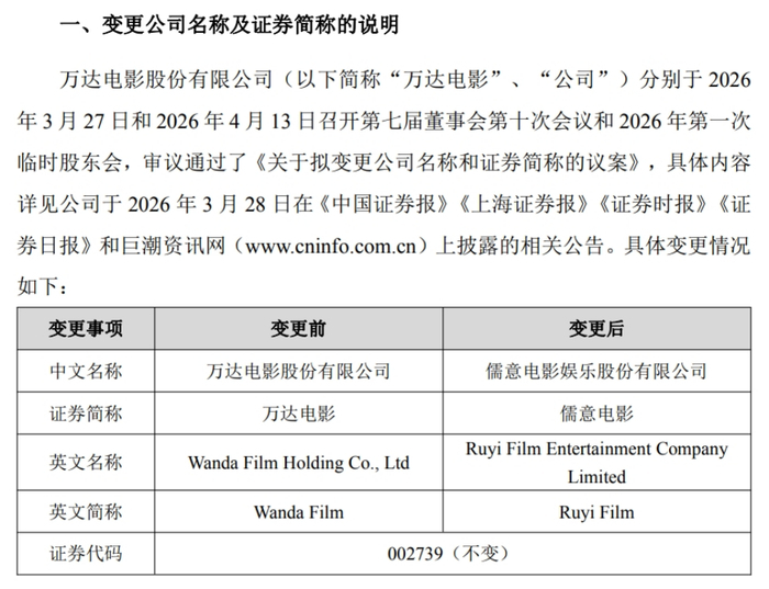 4月19日,万达电影发布公告,宣布正式更名为儒意电影娱乐股份有限公司。4月20日起,公司证券简称变更为“儒意电影”,证券代码“002739”保持不变。