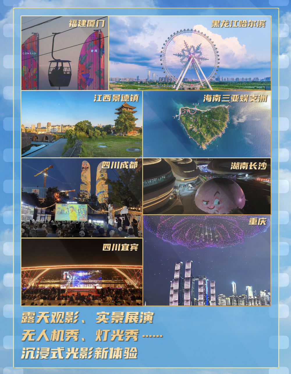 联动全国多地文旅部门,在黑龙江松花江畔、福建滨海沙滩、江西古街古镇、重庆山城江岸、浙江宁波等标志性地点,精心布置露天观影区、实景展演舞台,搭配无人机秀、灯光秀、帆船秀等,海陆空全覆盖,让光影元素融入旅途每一处细节。