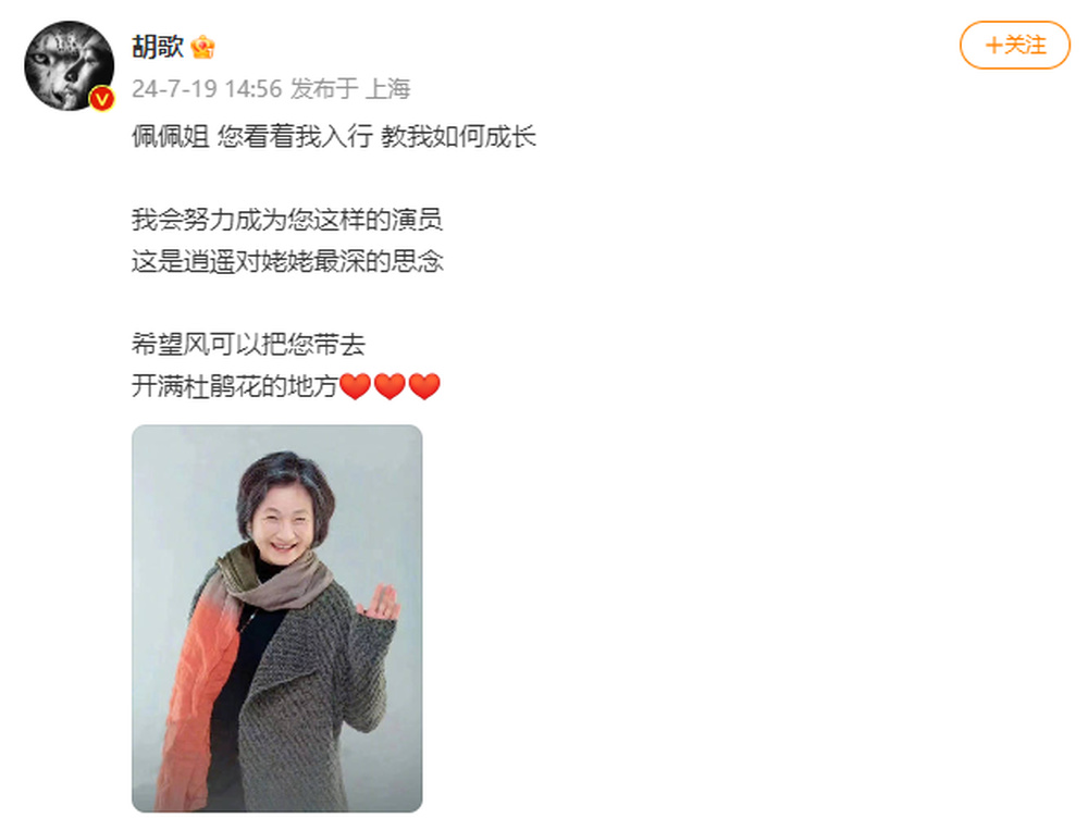 胡歌:“佩佩姐,您看着我入行,教我如何成长,我会努力成为您这样的演员,这是逍遥对姥姥最深的思念。希望风可以把您带去开满杜鹃花的地方。”