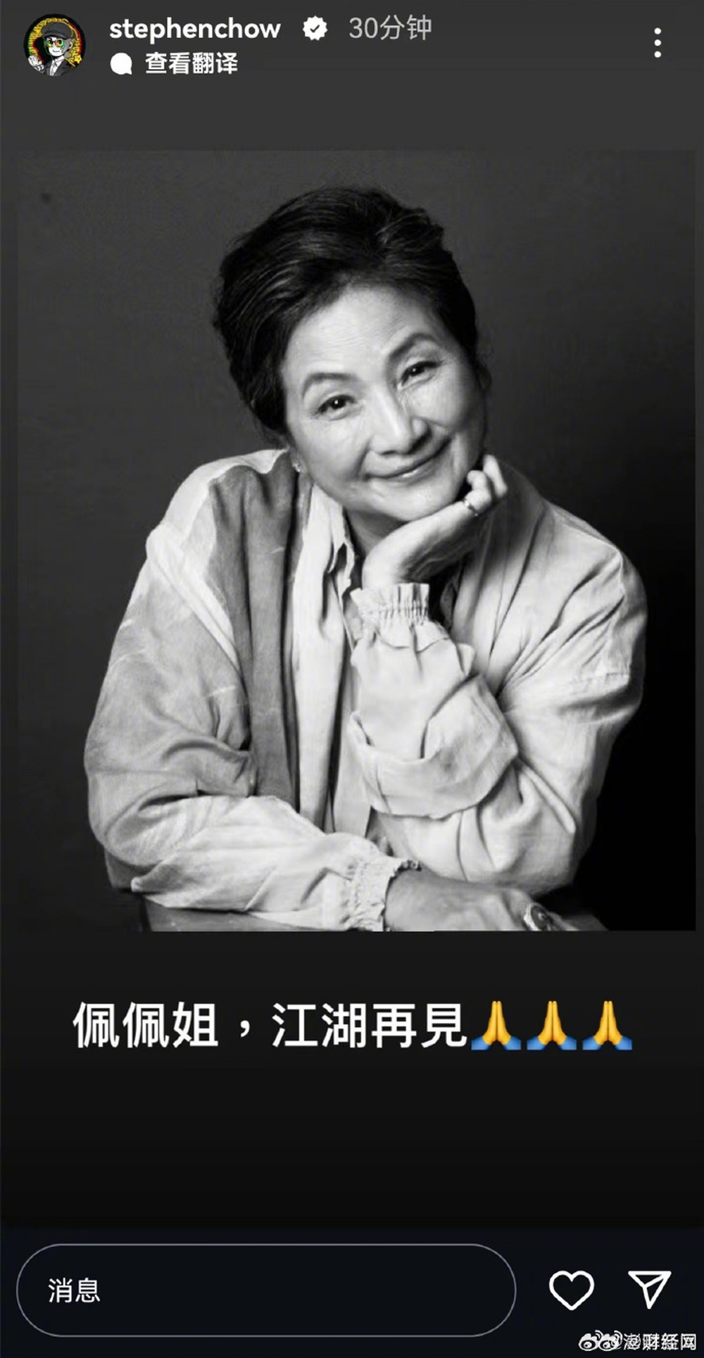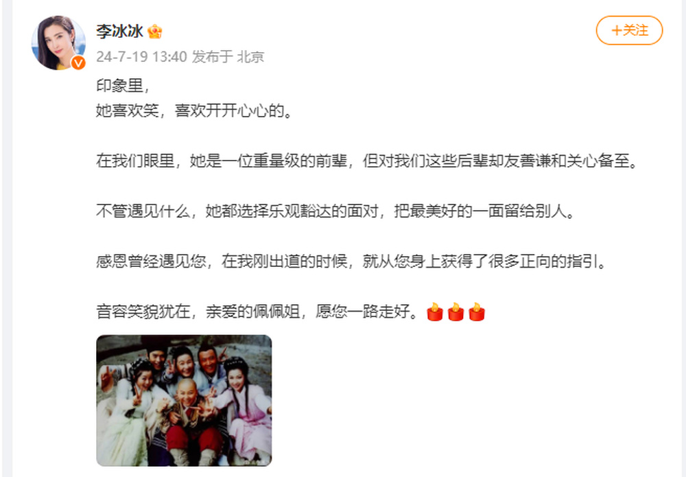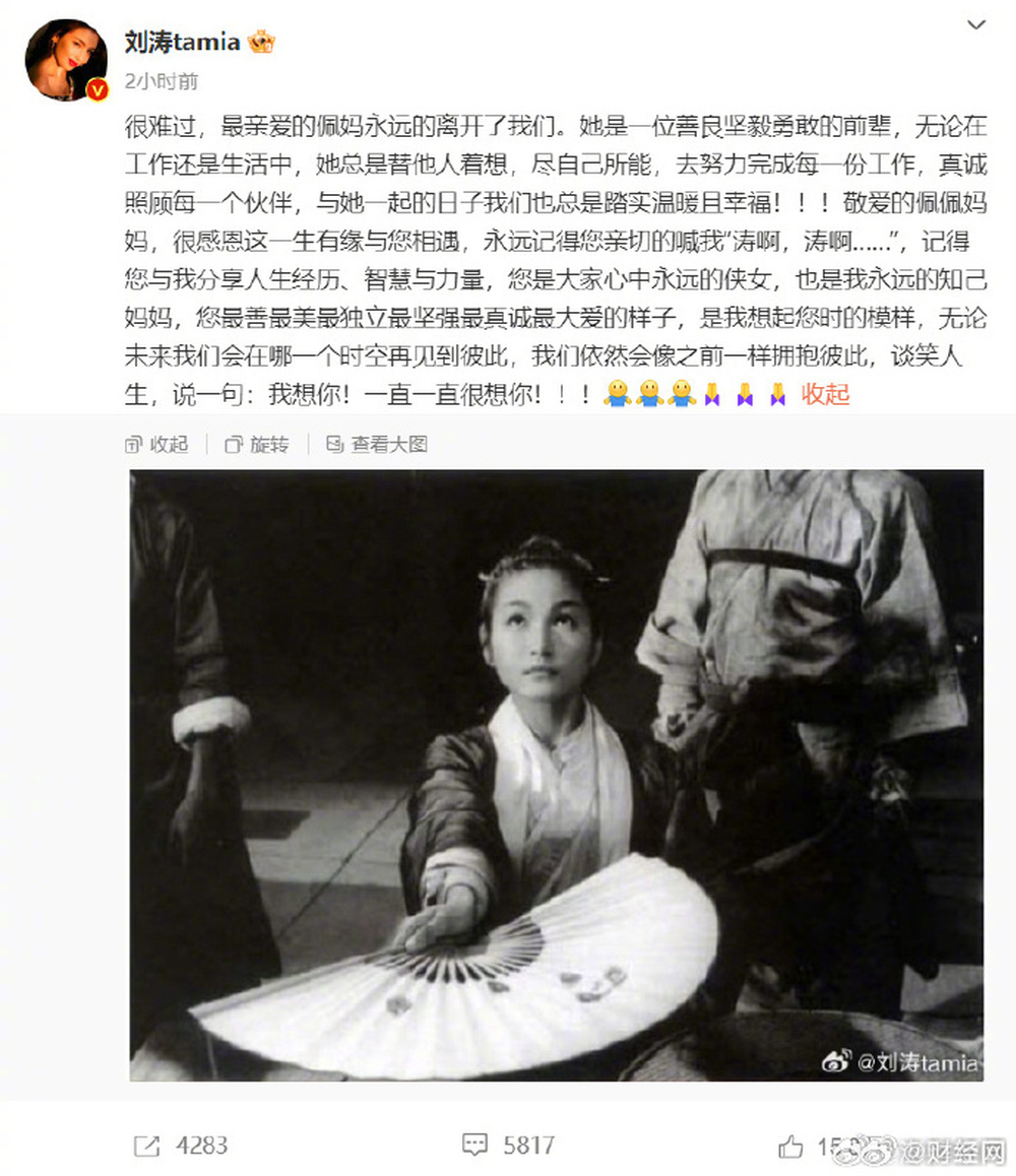 赵文卓:“佩佩姐,一路走好,总是喜欢照顾身边人,愿您的侠骨柔情永存人间。”
