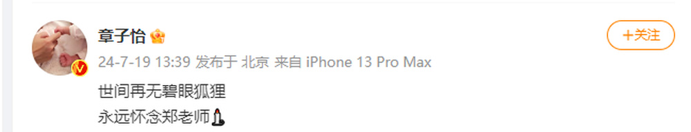 章子怡:“世间再无碧眼狐狸,永远怀念郑老师。”