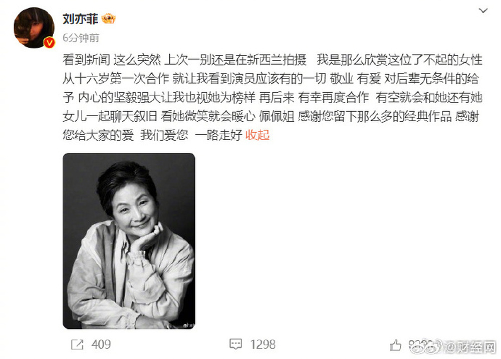 刘亦菲:“我是那么欣赏这位了不起的女性,从十六岁第一次合作,就让我看到演员应该有的一切,敬业、有爱,对后辈无条件的给予。内心的坚毅强大,让我视她为榜样。再后来,有幸再度合作,有空就会和她还有她女儿一起聊天叙旧,看她微笑就会暖心。”