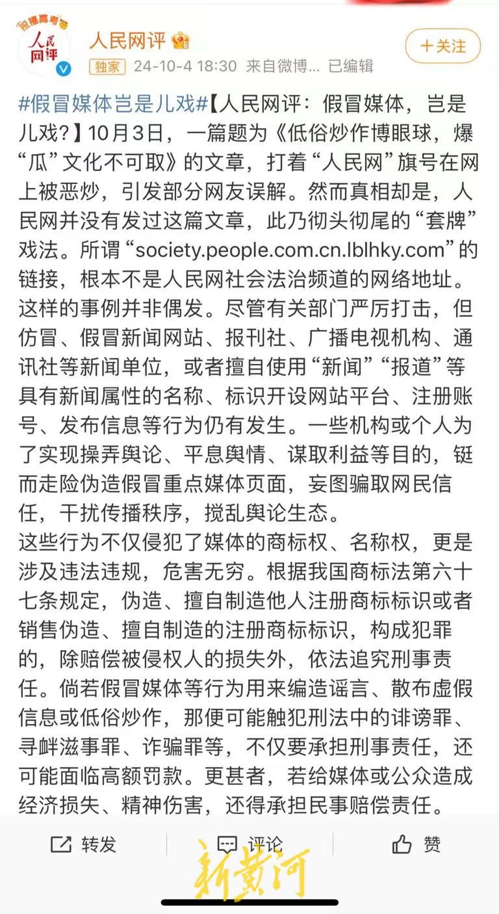 10月3日,一篇题为《低俗炒作博眼球,爆“瓜”文化不可取》的文章在网络上被广泛传播,文章打着“人民网”旗号,对辛雨锡曝光秦霄贤的行为进行了点评,并呼吁保护公众人物的隐私。该文章发布后,迅速被秦霄贤的粉丝和自媒体大量转发。