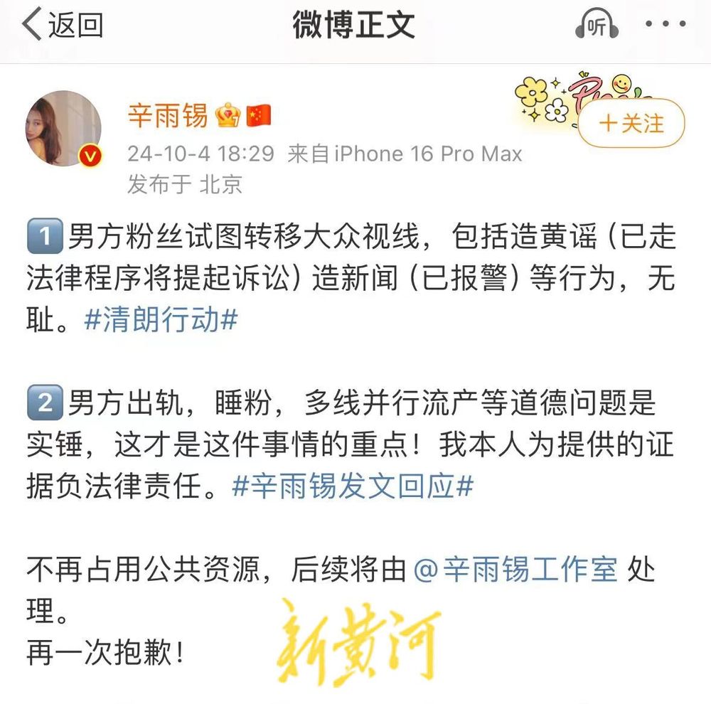 近日来,秦霄贤前女友辛雨锡在社交媒体上爆料称秦霄贤多次劈腿引发热议,10月4日,辛雨锡再发文,指责秦霄贤及其粉丝为了维护偶像形象诋毁自己,甚至伪造人民网文章四处发布。