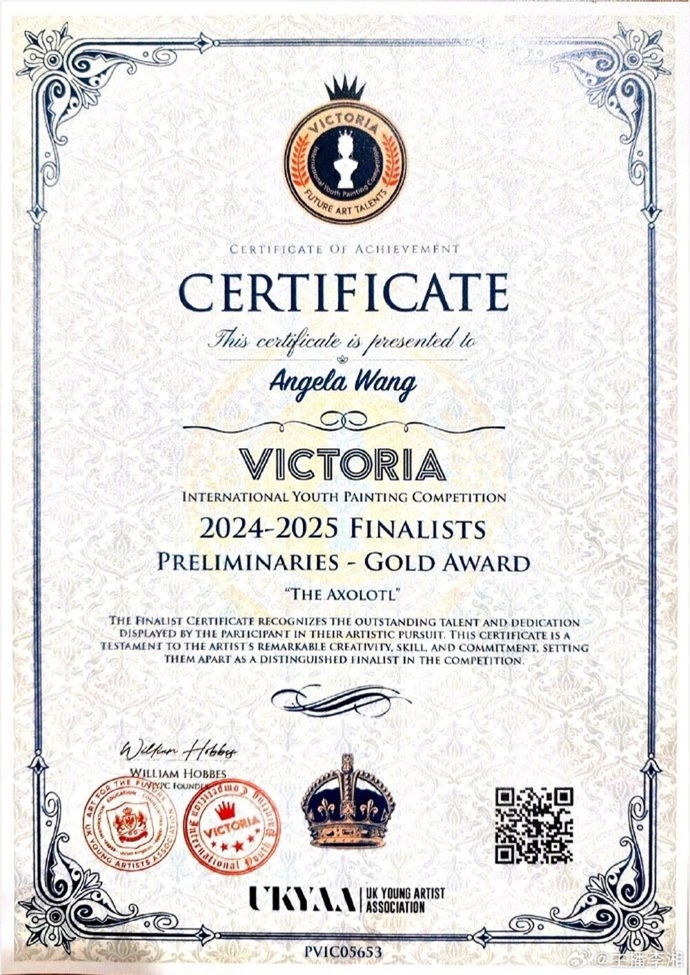 李湘和王岳伦分别发文:恭喜Angela! 获得Victoria International Youth Painting Competition 金奖!