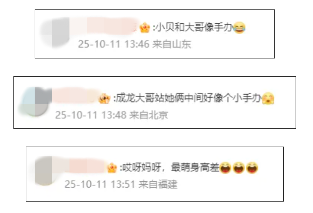 网友调侃“成龙大哥站两人中间像小手办”“最萌身高差”。