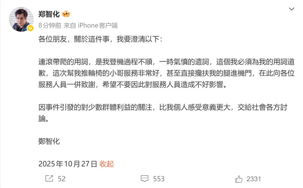 郑智化在微博中写道:连滚带爬的用词,是我登机过程不顺,一时气愤的遣词,这个我必须为我的用词道歉,这次帮我推轮椅的小哥服务非常好,甚至直接搀扶我的腿进机门,在此向各位服务人员一并致谢,希望不要因此对服务人员造成不好影响。