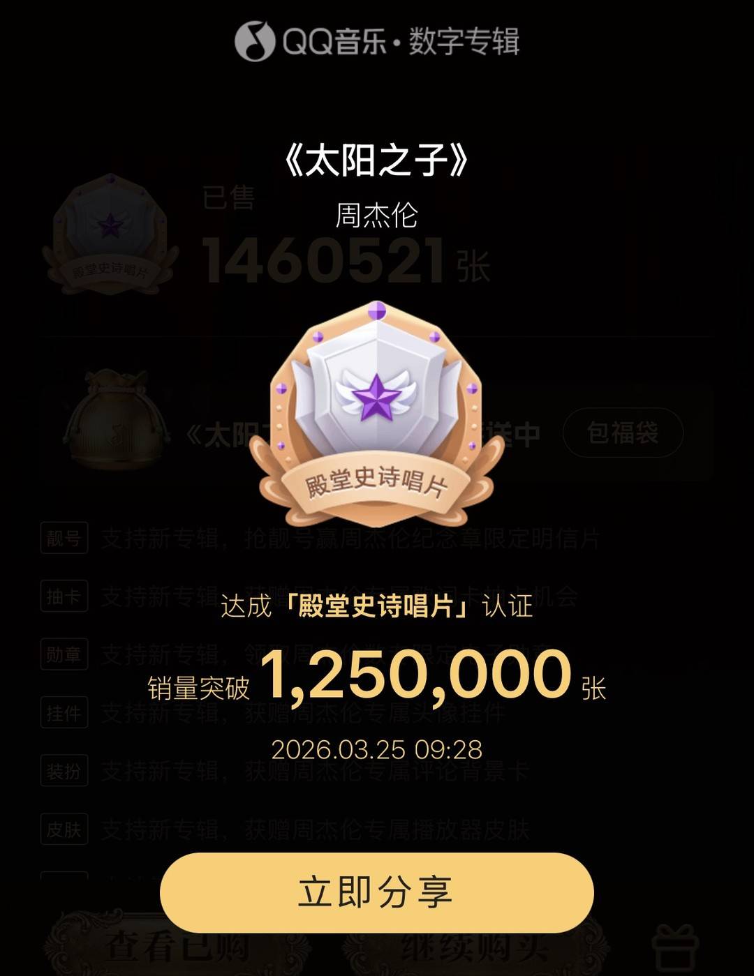 3月25日凌晨,备受期待的周杰伦全新专辑《太阳之子》正式上线发行。截至3月25日15点50分,该专辑内地全平台销量已达182万张,销售总额逾7000万元,超过蔡徐坤发行于2月6日的新专辑《KUN》的各项数据,目前暂列2026年数字专辑销量榜首。同时,《太阳之子》发行9小时,以125万张销量达成QQ音乐平台“殿堂史诗唱片”认证。