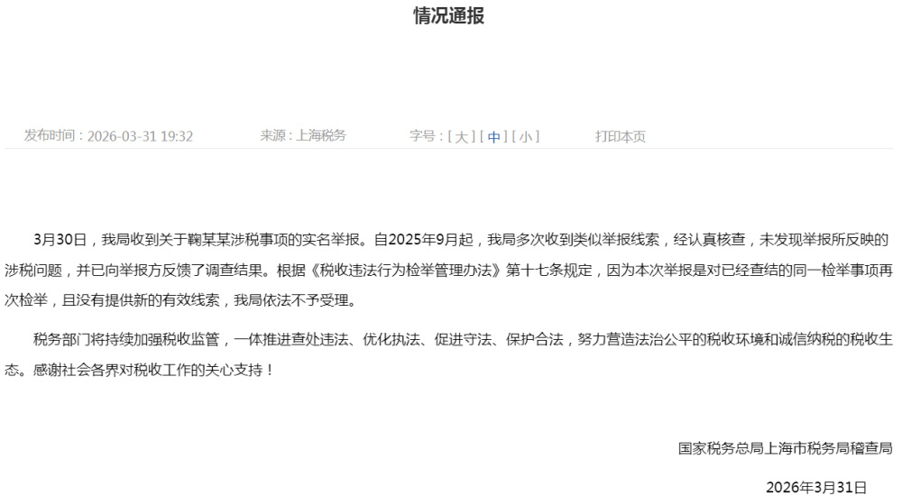 3月31日,国家税务总局上海市税务局发布情况通报:3月30日,我局收到关于鞠某某涉税事项的实名举报。自2025年9月起,我局多次收到类似举报线索,经认真核查,未发现举报所反映的涉税问题,并已向举报方反馈了调查结果。根据《税收违法行为检举管理办法》第十七条规定,因为本次举报是对已经查结的同一检举事项再次检举,且没有提供新的有效线索,我局依法不予受理。