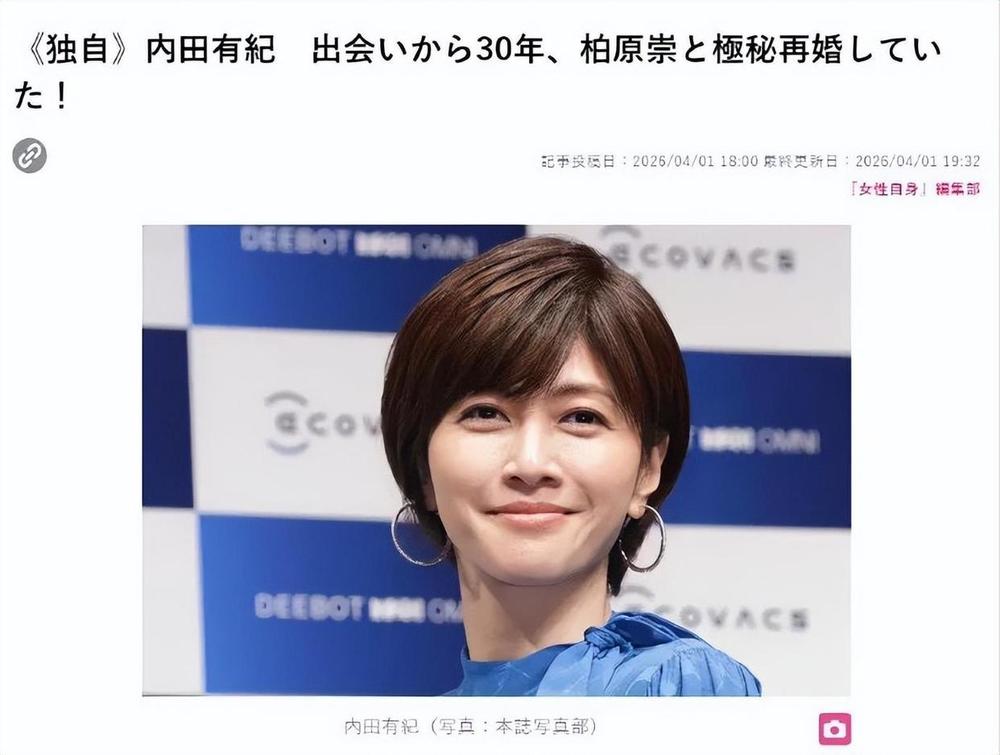 据@北青娱见 4月1日消息,日本知名演员内田有纪与柏原崇证实结婚,两人结束长达十余年的爱情长跑终成眷属。据悉,内田有纪所属公司"Ten Beans合同会社"的业务执行股东名称于2026年3月24日变更为"柏原有纪",法律上证实二人已婚。此事几乎未提前告知工作伙伴,仅通过公司变更信息曝光,经日媒《女性自身》独家披露后引发全网热议。网友大呼:哇,我的藤井树结婚啦!