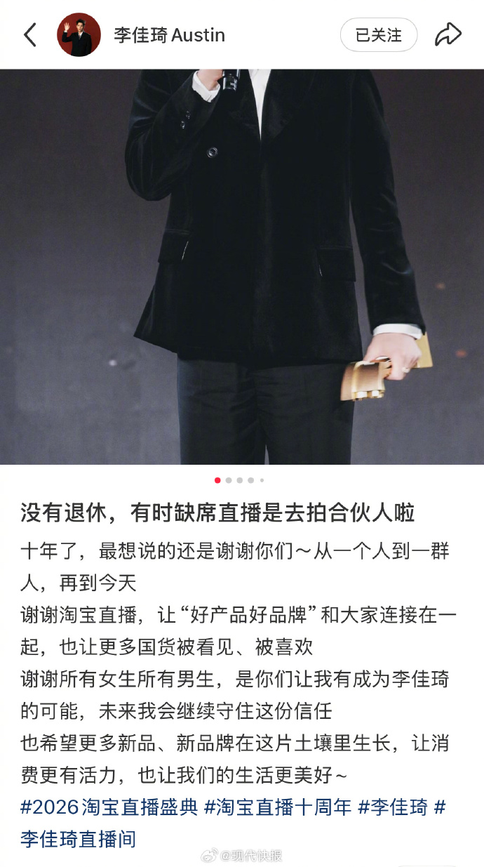 李佳琦深夜发声回应:没有退休,缺席是去拍合伙人、做新尝试。直播十年,从一人到一群人,感恩粉丝信任,未来将继续助力国货,让消费更有活力。