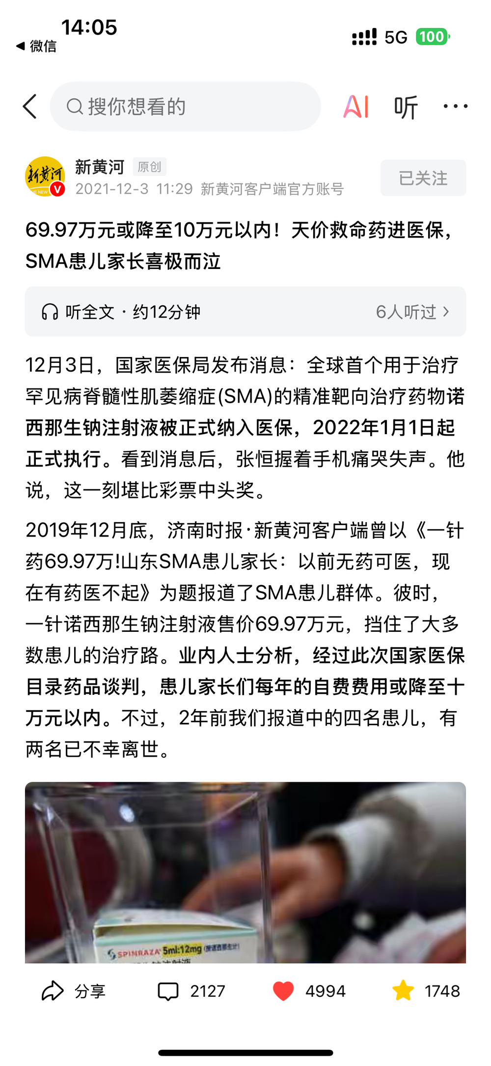 真正的转折,发生在2021年那场牵动亿万人心的国家医保药品目录谈判。经过一场被媒体称为“灵魂砍价”的谈判,诺西那生钠注射液被成功纳入医保,价格从55万元降至每针3万多元。从70万到3万,是成千上万个“小石头”家庭命运的彻底改写。