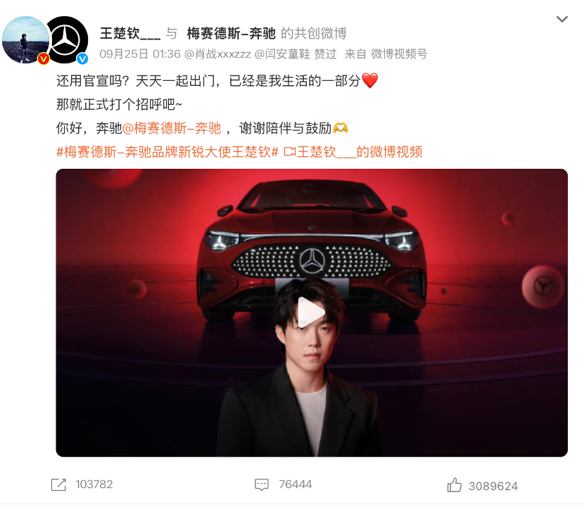 合作模式也从“长期绑定”变成“短平快精准打击”。十年前车企签明星,动辄三五年长约、千万级代言费,现在更倾向“单次活动+细分车型”:小鹏全新P7上市时,一口气找了钟楚曦、朱正廷、宁泽涛、陈妍希四位明星,钟楚曦以车主身份当“时尚代言人”,其他人则对应不同配色车型,覆盖不同受众;理想请易烊千玺,也主要围绕纯电SUV i6的上市周期,聚焦年轻市场;就连奔驰找王楚钦,也是为了配合全新纯电CLA 的推广——这种“短期合作”不仅降低成本,还能避免“明星塌房”的长期风险。