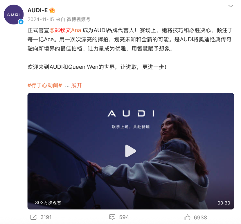 有人是“为爱下单”的粉丝:别克至境L7上市后,一位在威佳别克直接下订的车主说,“本来在看其他车,看到朱一龙代言就定了这款”;孙颖莎代言红旗天工06时,电商平台24小时预售突破8000台,远超品牌预期的5000台,42%的买家在订单备注里写“支持孙颖莎”;郑钦文代言的奥迪AUDI E5 Sportback,发布半小时大定就破万,不少网球迷留言“为了郑钦文,也要去试驾”——明星的“号召力”,确实能让车企快速打开知名度。