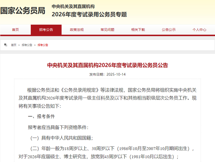 10月15日起,中央机关及其直属机构2026年度考试录用公务员报名正式开始,共计划招录3.81万人,报名截至10月24日18时。今年,延续多年的“国考”迎来了一次重大变化,报考者年龄上限从35周岁放宽至38周岁,应届硕士、博士研究生放宽至43周岁,“国考35岁门槛”成为历史。