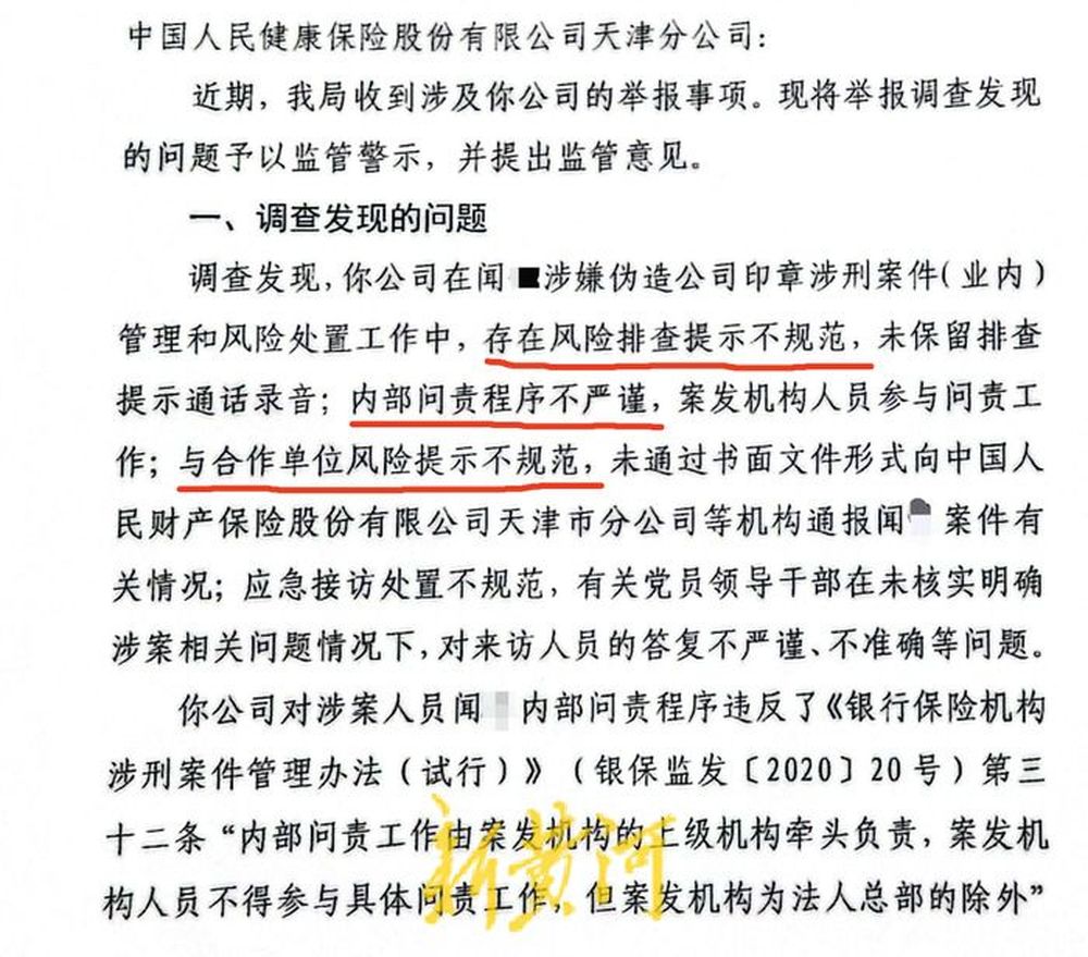 另外根据2023年12月国家金融监管总局天津监管局对人保健康天津分公司出具的《金融监管警示书》,人保健康天津分公司在闻某涉嫌伪造公司印章涉刑案件管理和风险处置工作中,存在风险排查提示不规范,未保留排查提示通话录音;内部问责程序不严谨,案发机构人员参与问责工作;与合作单位风险提示不规范,未通过书面文件形式向中国人民财产保险股份有限公司天津市分公司等机构通报闻某案件有关情况等问题。