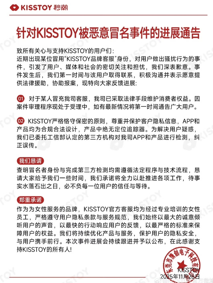 新黄河记者注意到,11月26日,KISSTOY品牌再次发布声明称,该公司App和产品均为合规合法设计,产品中绝无定位追踪器,公司已委托工信部认定的第三方机构对App和产品进行检测。针对近期出现有人冒用“KISSTOY品牌客服”身份,对用户做出骚扰行为的事件,公司深表歉意。该公司已采取法律手段维护消费者权益。因案件审理程序现处于受理中,如有最新情况将第一时间通告广大用户。