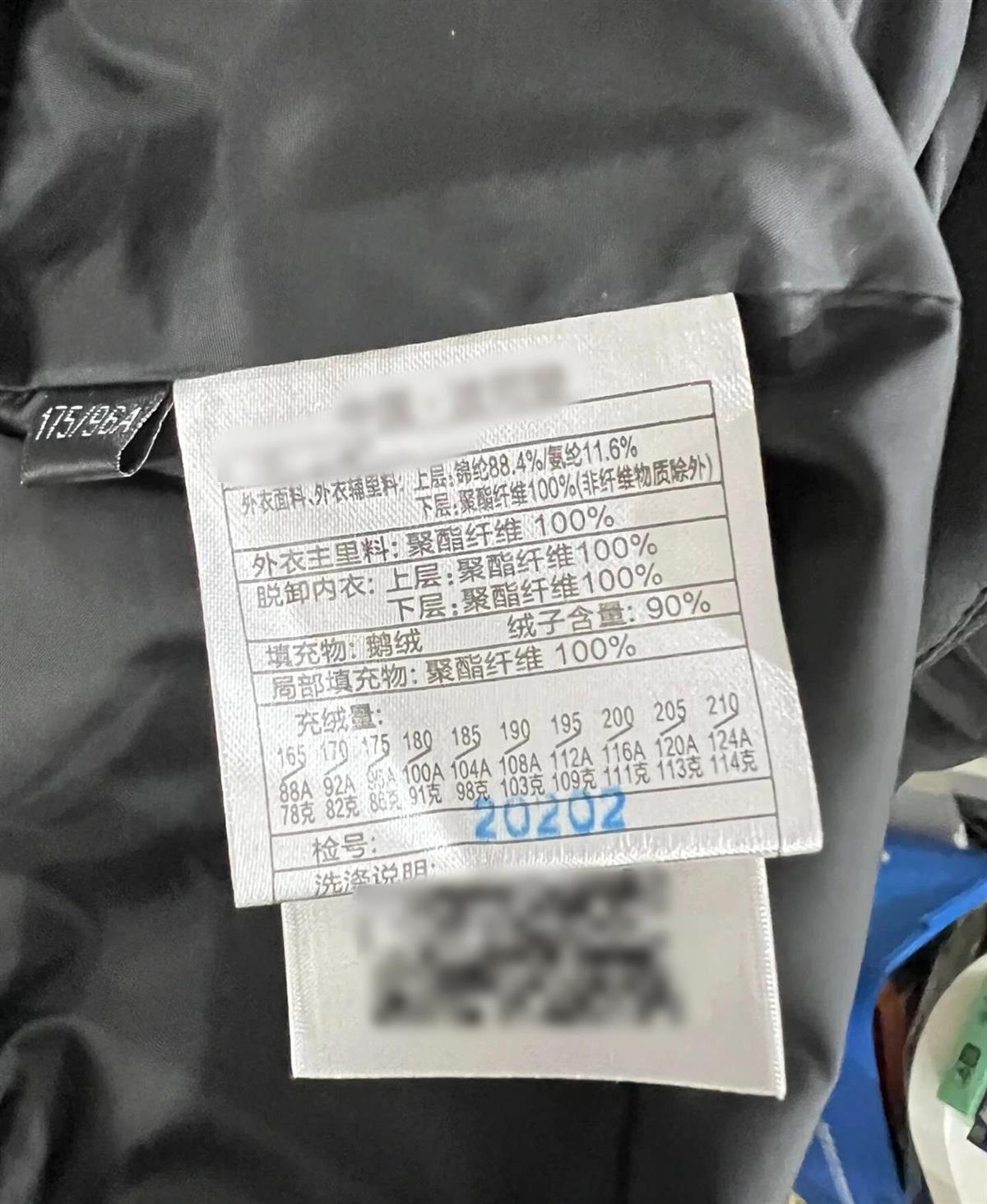 据极目新闻此前报道,有江苏网友发文称,这款售价2000多元的羽绒服,其水洗标显示175尺码的充绒量仅为86克。记者检索发现,这是该品牌2025年商务系列男款羽绒服,系可脱卸内胆鹅绒服,商品简介称绒子含量达90%,蓬松度有700.电商平台官方旗舰店上,这款羽绒服原价2299元,优惠后价格为1929元,目前已售1000多单,而不同尺码的充绒量有细微差异。当时该品牌旗舰店客服对记者解释,该羽绒服只有内胆是羽绒,86克是内胆的充绒量。