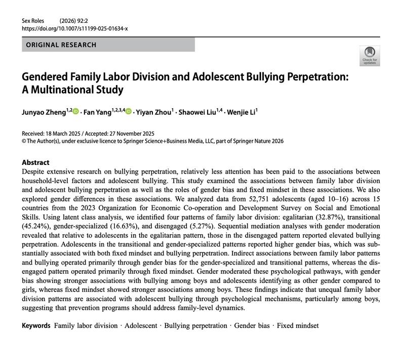 2026年2月,上海交通大学国际与公共事务学院副教授杨帆和他的研究生们在国际期刊《Sex Roles》(《性别角色》)发表了一项研究,尝试回答一个看似跨越很远的问题:家庭里的分工方式,是否会与青少年的欺凌行为产生联系。