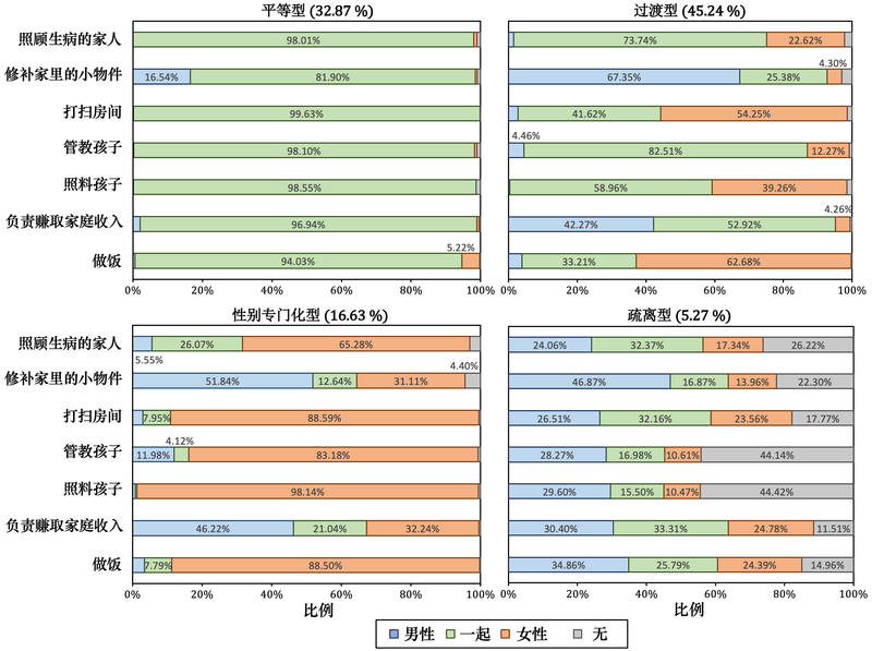 我们把家庭分工大致分成四种类型。大约三分之一的家庭是“平等型”,父母在育儿、家务和挣钱方面基本平等分担;有45%的家庭属于“过渡型”,母亲承担大部分家务和育儿,父亲也参与一些,母亲也工作挣钱,但可能比父亲少;约17%的家庭遵循“性别专门化型”,母亲承担几乎所有家务,而父亲则专注于赚钱;还有5%的家庭呈现“疏离型”,父母双方都没有持续地承担家庭责任。