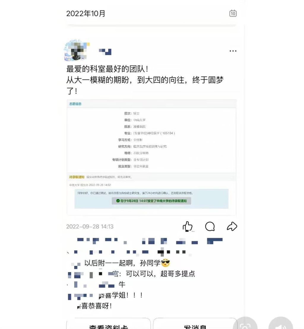 但他记得孙可欣在QQ空间发过被录取的动态,能感觉到她“特别激动和开心”。那是2022年9月,孙可欣收到了研究生复试通过的消息。她贴出了中南大学湘雅医院待录取通知的截图,写道:“最爱的科室最好的团队!从大一模糊的期盼,到大四的向往,终于圆梦了!”