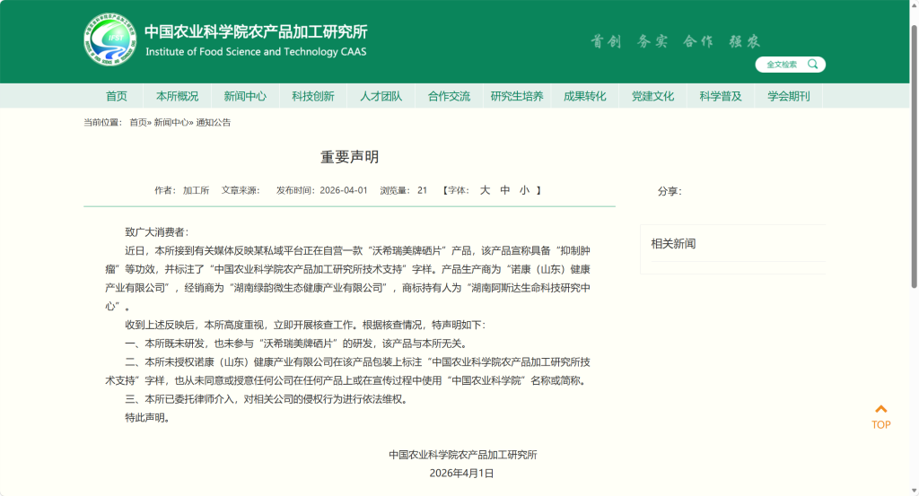 标榜的中国农业科学院农产品加工研究所“技术支持”,已被该所澄清