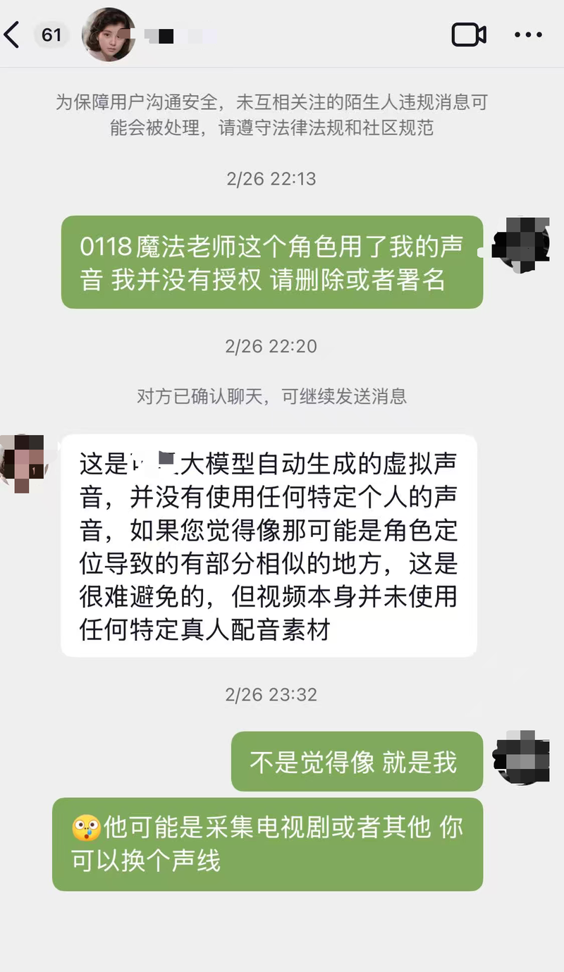 言一曾与发布AI真人短剧的博主交涉,但只收到没有使用任何特定个人声音的回复。受访者供图