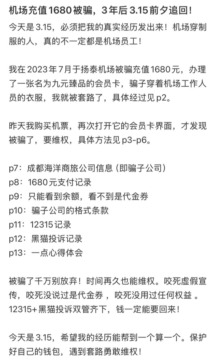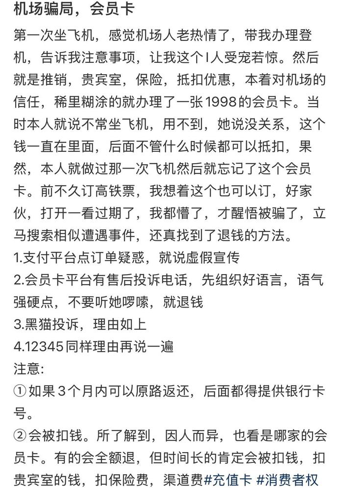调查发现,类似套路在社交平台上屡见不鲜。许多网友反映,有身穿统一制服的“工作人员”在机场热情推销,打着“免费贵宾厅服务”“免燃油费”的幌子诱导充值,实则只是从卡内扣除几十元抵扣券,且对有效期避而不谈。