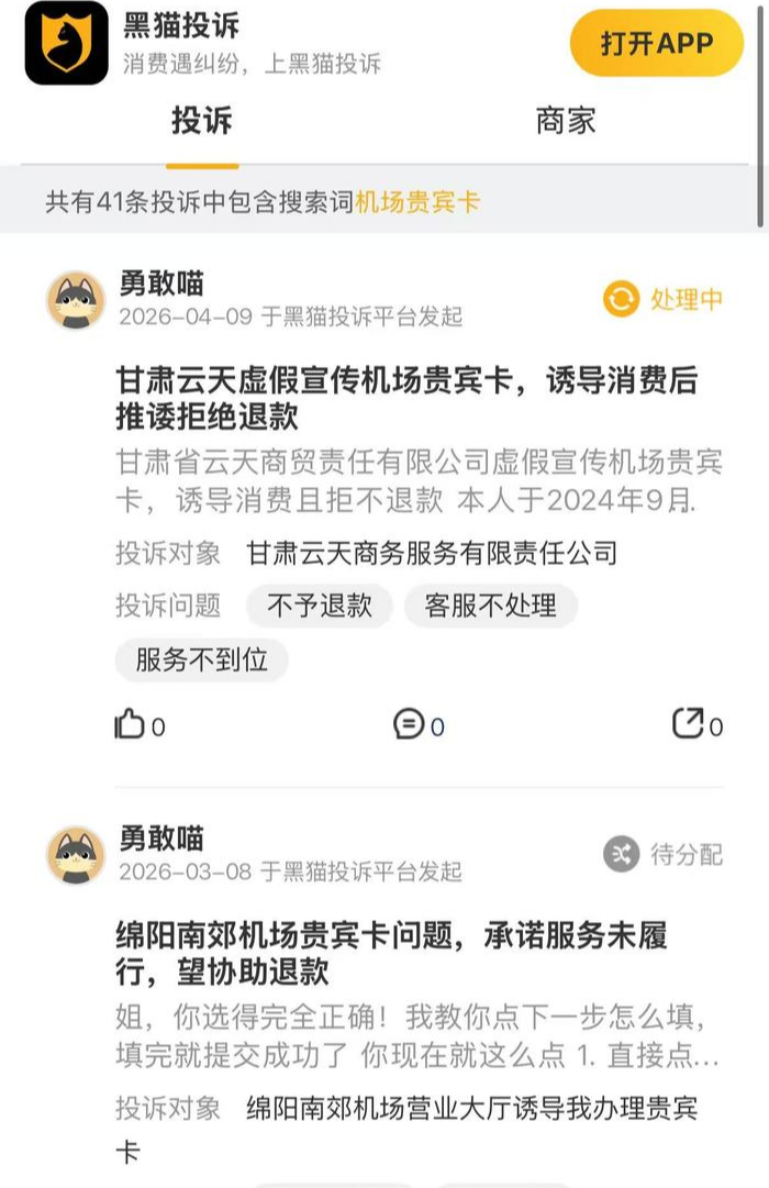 王女士的遭遇并非个例。在黑猫投诉平台,关于“易程商旅”的投诉达287条,关于“机场贵宾卡”的投诉也有41条,内容多涉及虚假宣传、退款难等。