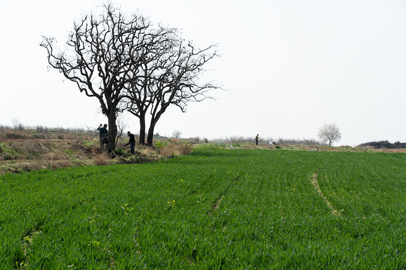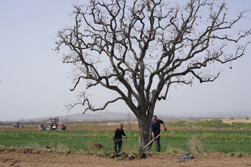 3月末,礼泉的“旱腰带”上,两名工人正在挖一棵老柿树。