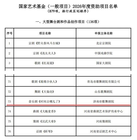 紧接着,国家艺术基金2026年度资助项目名单公布,济南市歌舞剧院原创音乐剧《时间去哪儿了》和济南市儿童艺术剧院《飞越母亲河》双双上榜。