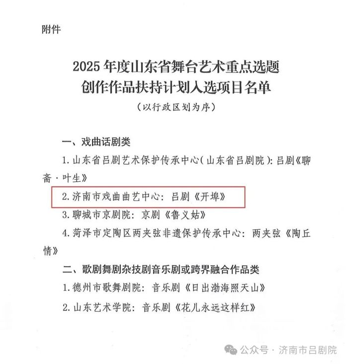 本次全省入选2025年度山东省舞台艺术重点选题创作作品扶持计划名单的作品共6部,其中由济南市戏曲曲艺中心精心筹备的新编历史吕剧《开埠》入选戏曲话剧类重点扶持项目。