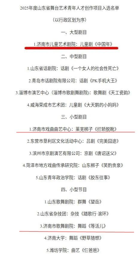 不久前,山东省文化和旅游厅陆续公布2025年度山东省舞台艺术青年人才创作项目及重点选题创作作品扶持计划入选名单。济南市属文艺院团表现突出,共有4部作品成功入选,涵盖吕剧、莱芜梆子、儿童剧、舞蹈等多个艺术门类,数量位居全省前列。