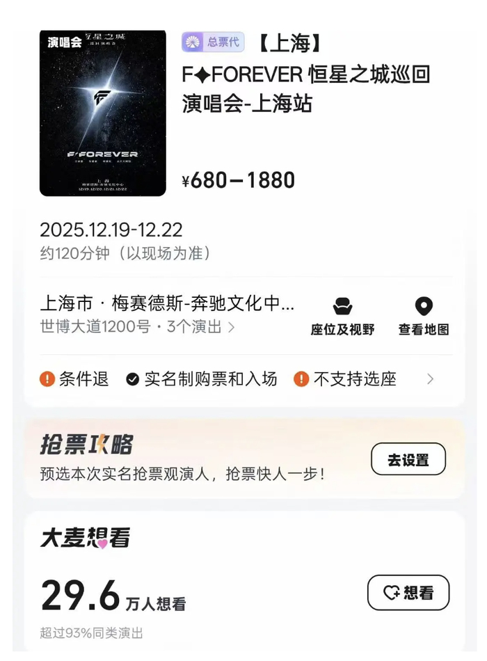 而在演唱会市场,怀旧同样是关键词。去年年底,一场由五月天所属的相信音乐操盘策划的“F✦FOREVER 恒星之城巡回演唱会”在上海连唱四场,将这场怀旧浪潮推向了高潮。这场为纪念F4成立25周年而生的合体,由原成员言承旭、周渝民、吴建豪与五月天主唱阿信组成特别阵容亮相,演出的市场反响却极为火爆——据大麦平台显示,有近30万人标记了“想看”,四场共约5万张门票在开售后1秒内即告售罄。演唱会上,不仅有周杰伦作曲、阿信作词的新歌《恒星不忘 Forever Forever》首唱,言承旭更是拿出了《流星花园》中送给杉菜的流星项链。