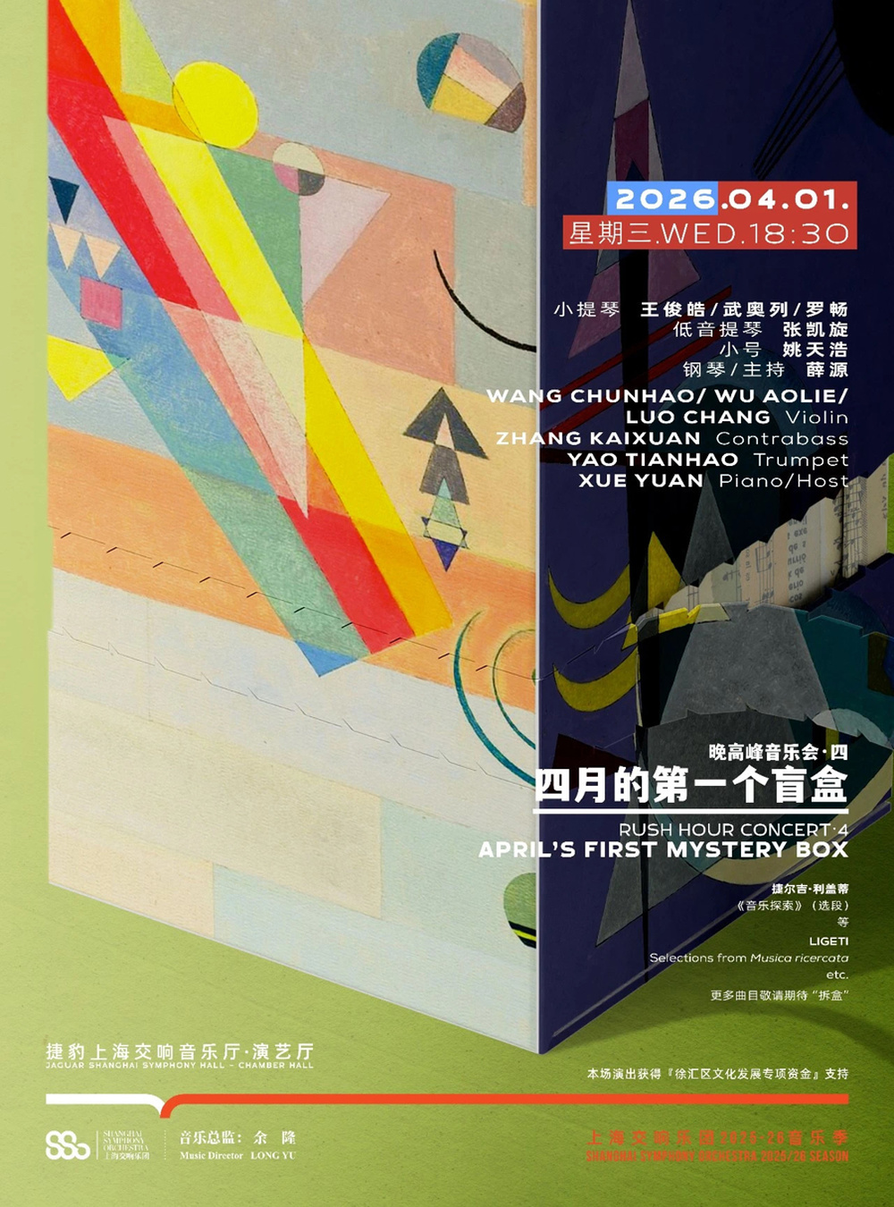 当一场音乐会只有一首曲目是公开的,其余作品全部“保密”,你还会买票入场吗?华灯初上,当城市车流汇入迷离夜色中,越来越多都市白领选择“用堵车的时间换一次和古典乐的邂逅”。自2019年诞生至今,已走过整整7个年头的上海交响乐团“晚高峰音乐会”,即将于4月1日举行的演出破天荒打出“盲盒牌”——仅公开利盖蒂《音乐探索》一首曲目,其余作品全部保密,需待现场揭晓。