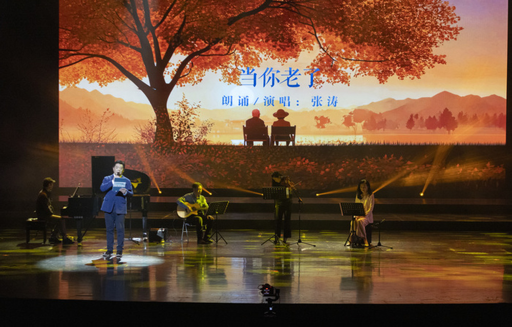 本次音乐诗会节目编排融合中外经典与现代诗作,通过“寻诗之径”“海外诗篇”“诗意人生”等几个篇章交织呈现在舞台上。开篇《四月的纪念》以朗诵与钢琴奏响春的序曲,随后从赫尔德林《诗意地栖居在这大地上》的哲思,到叶芝《当你老了》的深情咏唱,观众的情绪被层层带动。